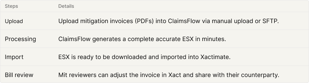 ClaimsFlow allows mitigation reviewers to seamlessly convert PDF invoices into Xactimate projects in minutes, eliminating the manual transcription process that slows teams down.