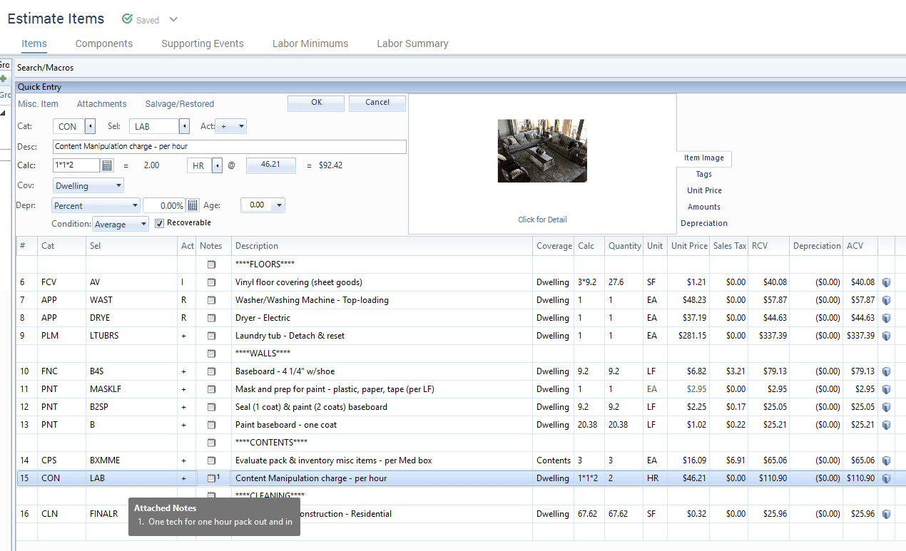 In the example below, attachments categorize and structure the work for each room: FLOORS, WALLS, CONTENTS, CLEANING.Compelling: Notes and documentation help link the Xactimate line items to the work required to restore the property. The closer the link, the more compelling the estimate.