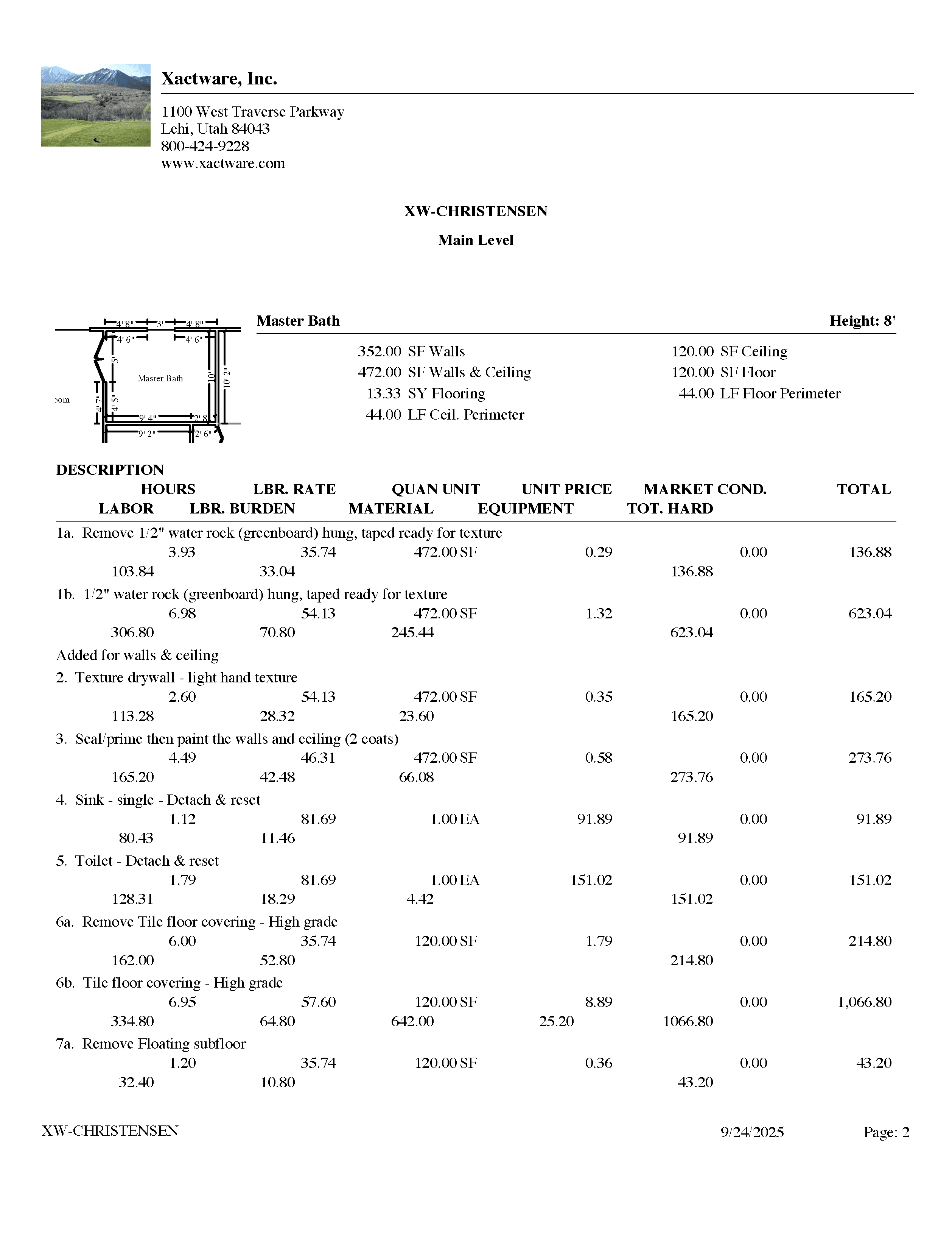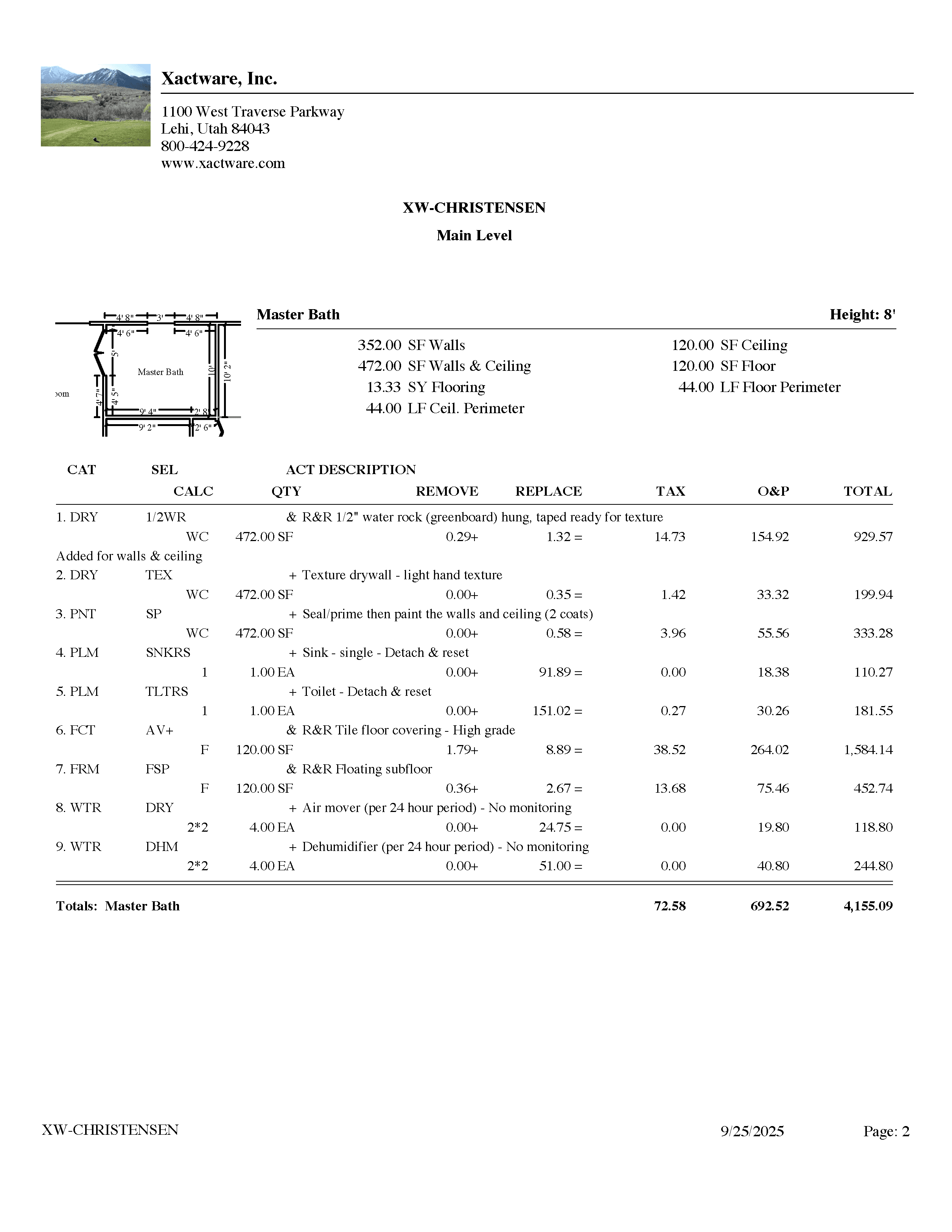 Description: Provides an overview of the estimate, no sketch or dimensions. Excludes RCV, tax, and O&P.